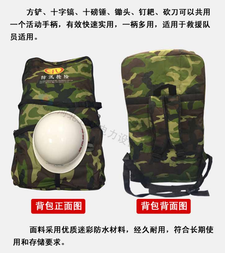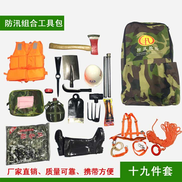 防汛組合工具包19件套:鎬、鈀、鋤頭、十磅錘、砍刀、方鏟、電筒、水鞋、防汛戰(zhàn)斗服、防寒雨衣、救生繩、雙背帶、救生衣、毛巾、水壺、頭盔、消防斧頭、信號(hào)燈、工具包。該組合工具包輕便、工具配備齊全適用于救援隊(duì)員使用。