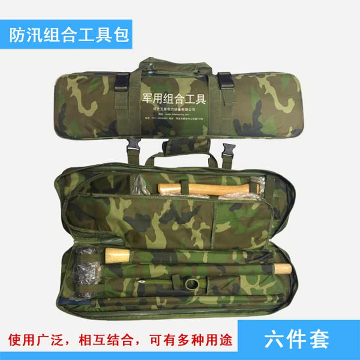防汛組合工具包六件套:鍬、鎬、消防斧、十磅錘、鋸、撬棍、兩節(jié)連接桿、工具包。一柄多用,適用于消防隊員使用